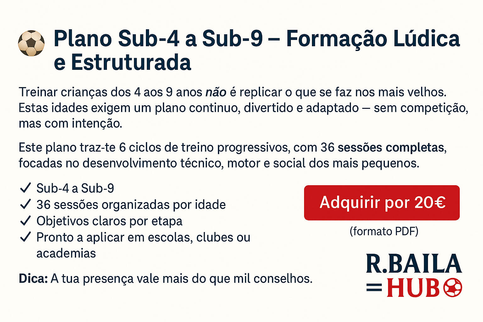 🧠 Subscrição mensal com conteúdos semanais para pais que querem ajudar os filhos a evoluir no futebol com equilíbrio, confiança e inteligência.📬 4 mensagens disponíveis com:Dica prática e educativa